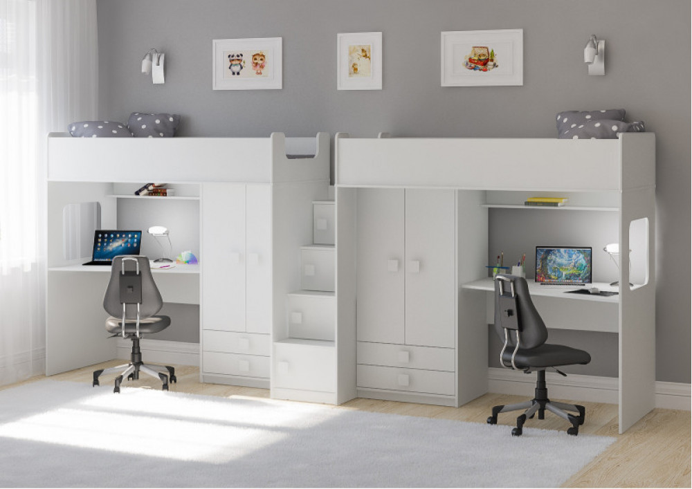 Две кровати, два шкафа, две игровых зоны – одна лестница. Идеальный вариант для двоих детей!