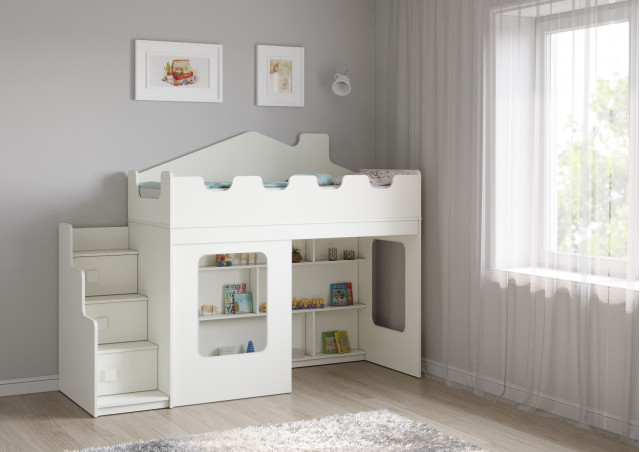 Под кроватью находится большая игровая зона, которая будет особенно интересна для детей. А фронтальная стенка со световым окном создаст атмосферу уюта и волшебства. Мягкий противоударный кант на бортах кровати и лестницы предотвращает возможные травмы и обеспечивает безопасность использования кровати-домика.