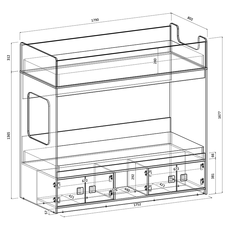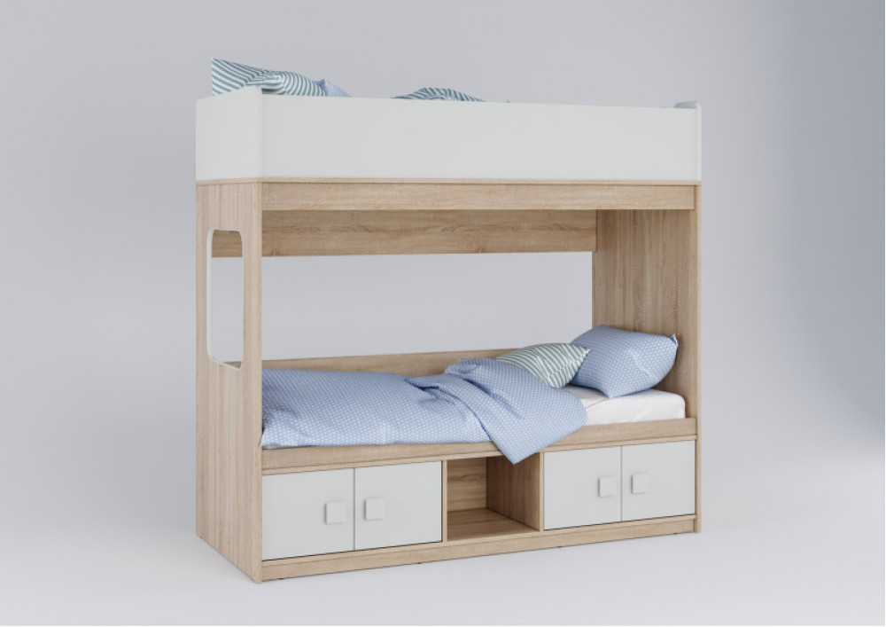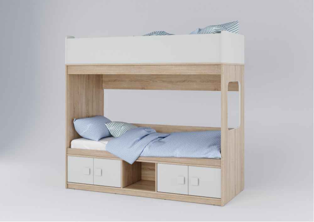 Классическая детская двухъярусная кровать с двумя параллельными спальными местами размером 1750х750 и 1900х750 и закрытыми местами хранения.